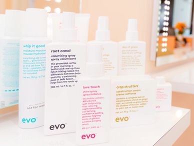 EVO hair products are divided into 6 product families, catering for different hair needs and distinguished by colour-coded packaging.